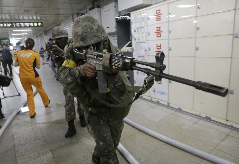 | Χαρακτηριστικό στιγμιότυπο από «αντιτρομοκρατική» άσκηση στρατιωτών που συμμετείχαν πρόπερσι στα γυμνάσια «Ulchi Freedom Guardian» στο μετρό της Σεούλ |