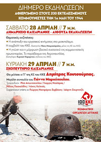 Η Κομματική Οργάνωση Αττικής του ΚΚΕ διοργανώνει Διήμερο Εκδηλώσεων, αφιερωμένο στους 200 κομμουνιστές που εκτελέστηκαν την 1η Μάη 1944, σήμερα Σάββατο 28 και αύριο Κυριακή 29 Απρίλη.