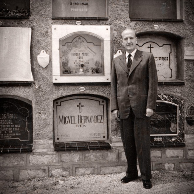 Ο Βισέντε Αλεϊχάντρε στον τάφο του Μιγέλ Ερνάντες. (Πηγή: poetica2puntocero.com)